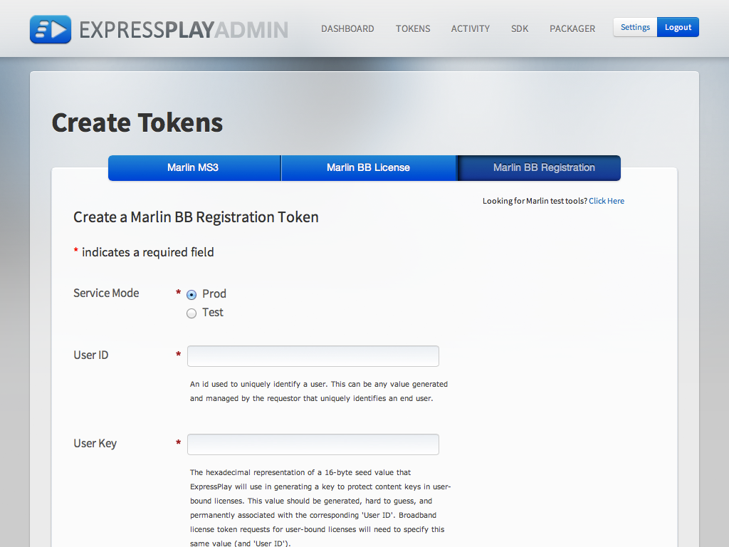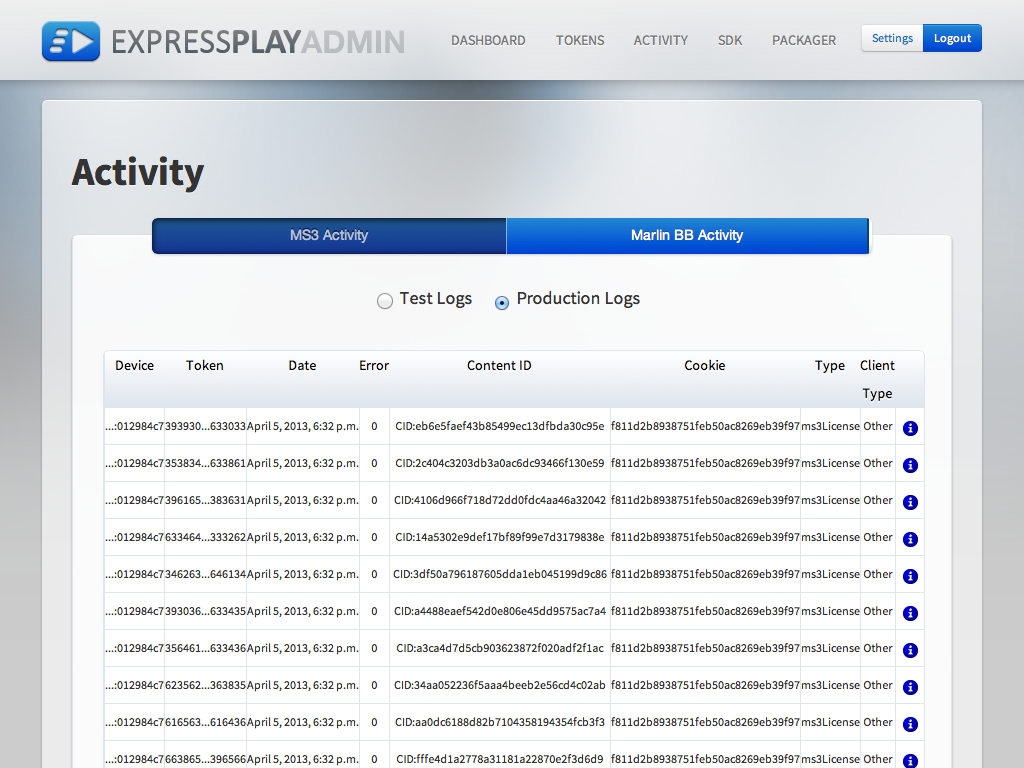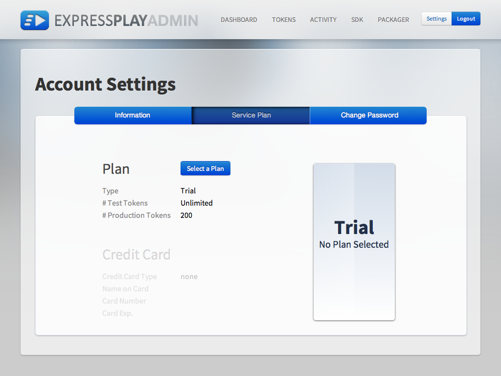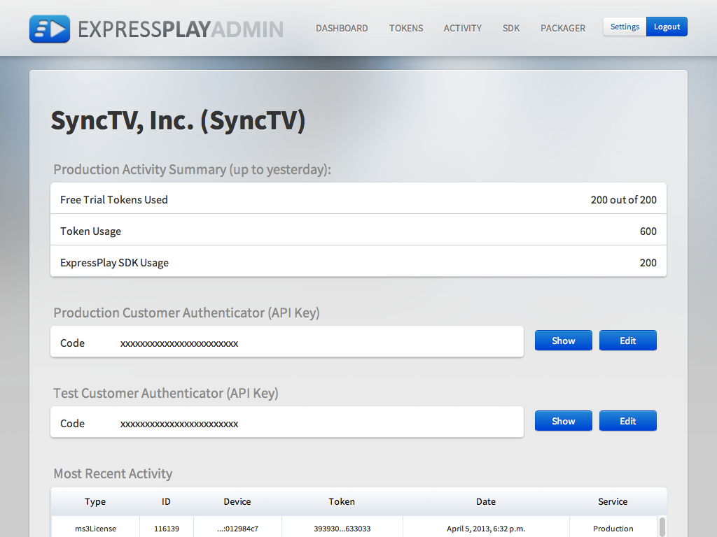 ExpressPlay Admin is a web-based administration console to manage your ExpressPlay account. From ExpressPlay Admin you can view summaries of your account and token activity, manage your service plans, get detailed activity log data, access the latest packaging tools, SDK and test tools.